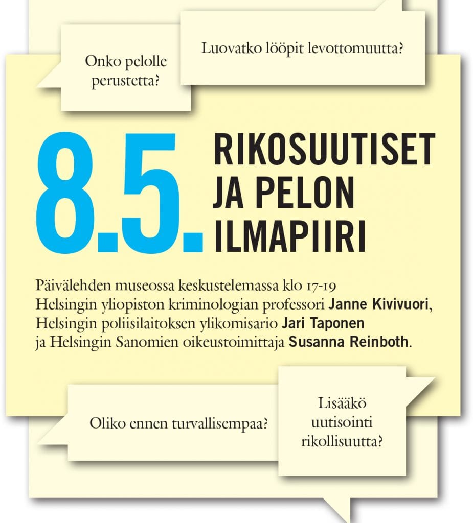 Ovatko rikosuutiset lisääntyneet? Miten uutisointi vaikuttaa ihmisten turvallisuudentunteeseen? Keskustelijoina Helsingin yliopiston kriminologian professori Janne Kivivuori, Helsingin poliisilaitoksen ylikomisario Jari Taponen sekä Helsingin Sanomien toimittaja Susanna Reinboth.
