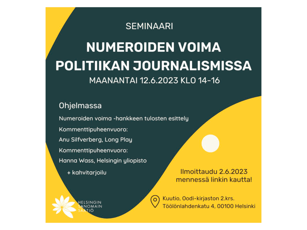 Tervetuloa Numeroiden voima politiikan journalismissa -seminaariin Helsingin keskustakirjasto Oodin Kuutio-työskentelytilaan (Töölönlahdenkatu 4, 00100 Helsinki) maanantaina 12.6.2023 klo 14.00-16.00.